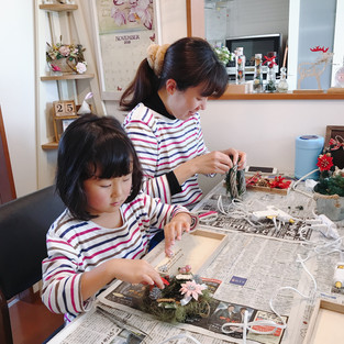お母さまたちもリース作り初体験とのことで、土台から作っていくリースを楽しんでいただきました。